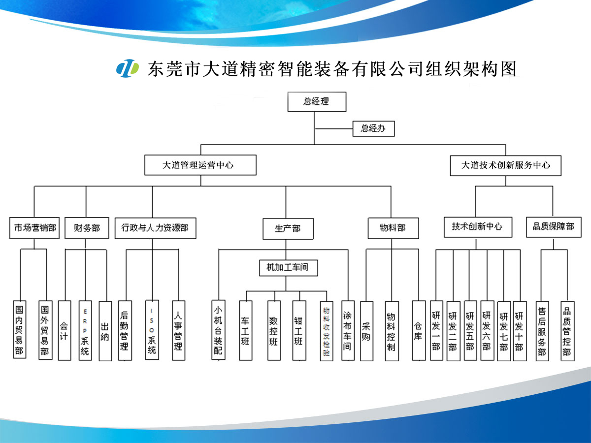 大道精密成立于2019年,公司注冊資本1000萬元,擁有辦公室、廠房等18,000多平方米。已通過ISO9001:2015國際質量管理體系認證,擁有國家各類專利共計58項,獲得“中國大道.商標”和“一帶一路十周年 .國禮品牌”等榮譽稱號,屬于國家高新技術企業,專精特新中小企業。2023年4月成立了“東莞市大道精密智能裝備有限公司關心下一代工作委員會”,是東莞市企石鎮工商聯副會長單位、東莞市企石鎮文學藝術界聯合會副主席單位、東莞市環保包裝行業協會副會長單位、東莞市數控裝備行業協會第二屆會長單位、廣東省包裝技術協會常務理事單位、廣東省膠粘劑行業協會理事單位、國家標準《機械安全中安全防護授權系統的基本要求》起草單位。